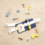 A tool belt which contains carpentry tools and accessories, such as a foldable level ruler, screwdriver, hammer, wrench, and screws etc. Children can tie it around their waist so they have all their tools to hand.