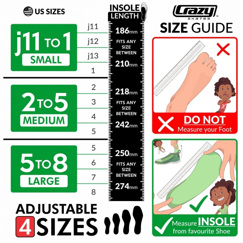 The 148 Adjustable Inline from Crazy Skates features specifications typically reserved for more expensive inline skates. The 148 is the perfect beginner inline skate that will skate, like a skate should. It features Quality Urethane Wheels (not Plastic like many other beginner skates) this ensures the skater gets great roll with plenty of grip for turning. ABEC 5 full precision bearings will give plenty of speed. The all nylon boot and frame construction is strong and durable (as beginner skates need to be) providing the correct support and cuff stiffness for developing skaters. The fitted, breathable mesh liner is extremely comfortable and combined with the ventilated shell means you can skate for hours without your feet getting all hot and sweaty. The 148 is a feature packed, high quality inline skate that will be sure to start your LOVE for skating!