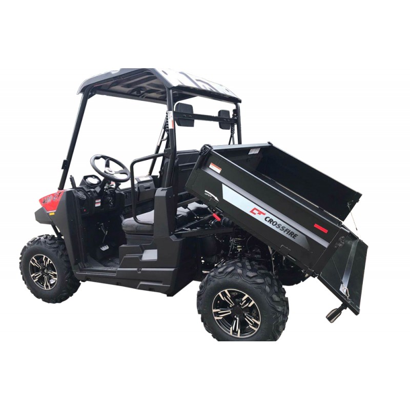Crossfire 400GT is a midsized side by side UTV featuring a gutsy 23HP motor perfect for off-road use and farming applications. The 400GT is a workhorse with a tray that is larger than most in the mid-sized category. With a great turning circle thanks to the turf mode setting and fairly light weight, the Crossfire 400GT will go over and not sink into the land. Did we mention the 400GT also comes equipped with both front and rear differential lock?The tray is a tipper (90cm*131cm) tray with hydraulic assister struts to help get load off quicker. All sides of the tray open so you can unload from the rear or any of the sides of the machine.The included roof and the windscreen provides shelter on those not so nice days. Not forgetting the winch which is now equipped with a remote control for easier operation in a sticky situation.