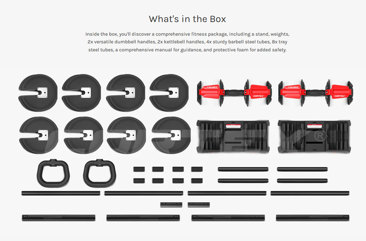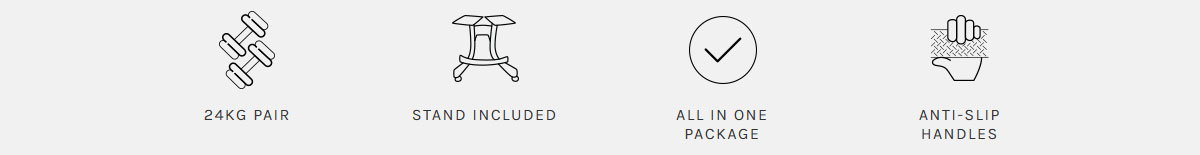 | Package Components | Dumbbell: 3kg - 24kg. Kettlebell: 2kg - 12kg. Barbell: 4kg - 24kg. |