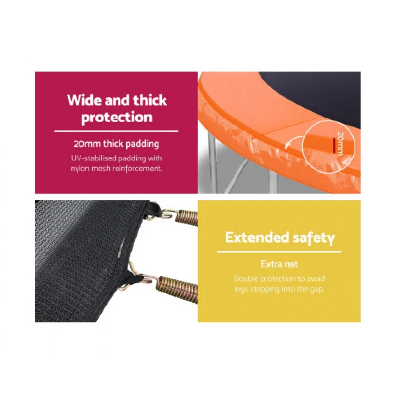 Bounce to your heart’s content with the Everfit Trampoline. With its superior bounce characteristics featuring 64-piece triple rate springs, the 10-foot Trampoline enables safe and durable bouncing with no worries. The heavy-gauge steel framework is designed to handle all robust play and is UV-tested for quality and reliability. Other great features include a curve design for more rigidness, 20mm thick padding, anti-graze mat, safety netting and a double-lock zip-and-clip entry. Not least, the included basketball hoop, basketball and pump really adds an awesome fun factor to the entire ensemble.