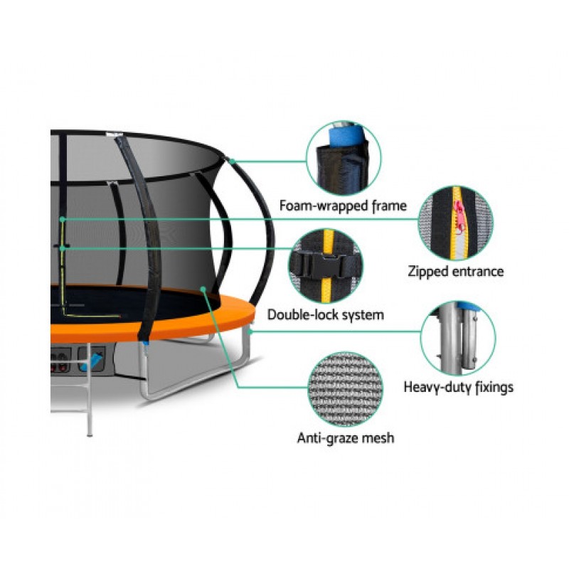 Bounce to your heart’s content with the Everfit Trampoline. With its superior bounce characteristics featuring 72-piece triple rate springs, the 12-foot Trampoline enables safe and durable bouncing with no worries. The heavy-gauge steel framework is designed to handle all robust play and is UV-tested for quality and reliability. Other great features include a curve design for more rigidness, 20mm thick padding, anti-graze mat, safety netting and a double-lock zip-and-clip entry. Not least, the included basketball hoop, basketball and pump really adds an awesome fun factor to the entire ensemble.