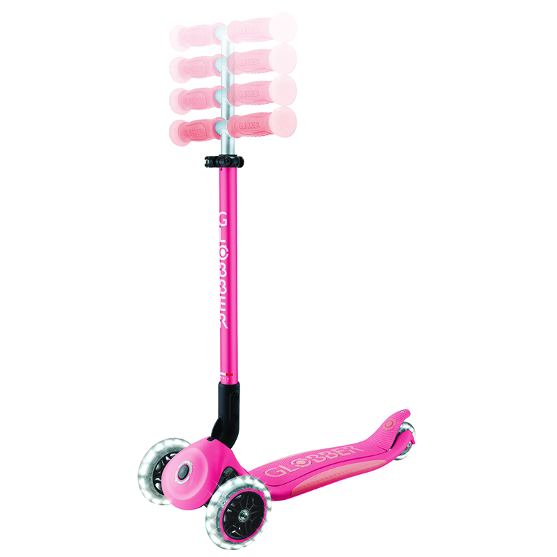 Globber’s ELITE GLOW LIGHTS is a foldable scooter thanks to Globber's patented elliptic folding system; folding a scooter is fast & easy! Easily fold up the 3-wheel scooter for kids without removing the T-bar from the scooter with a simple press of a button.