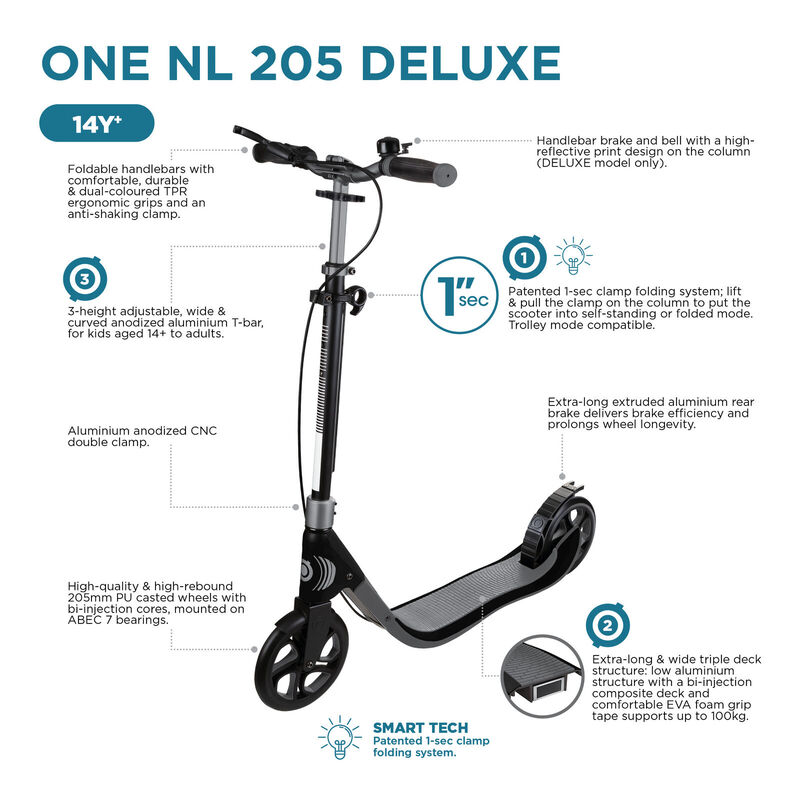 HIGH-QUALITY SCOOTER WHEELS- Collapsible scooter for teens and adults aged 14+ is equipped with high-quality and high-rebound 205mm PU casted wheels, mounted on ABEC 7 bearings.