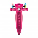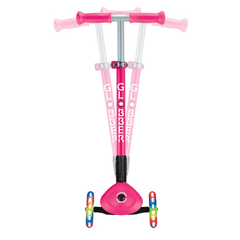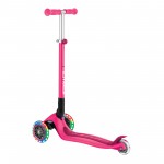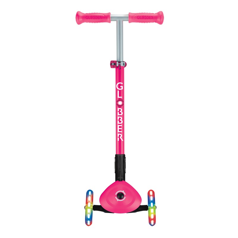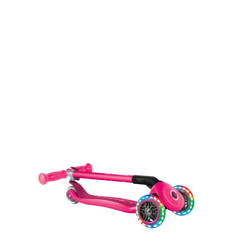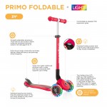 FOLDABLE 3-WHEEL KIDS SCOOTER- PRIMO FOLDABLE LIGHTS is a 3-wheel foldable scooter for kids, thanks to Globber's patented folding mechanism with a push button; folding a scooter is fast & easy! With just a push of a button, you can easily fold up the scooter to carry it in trolley mode and conveniently store it away after playtime!