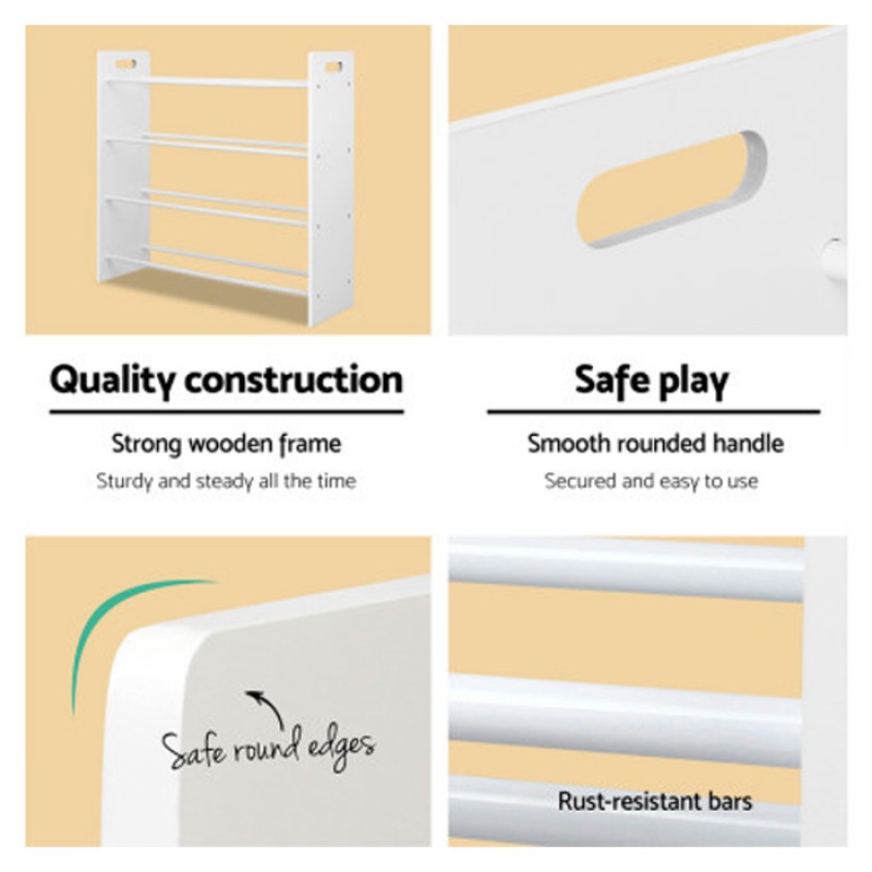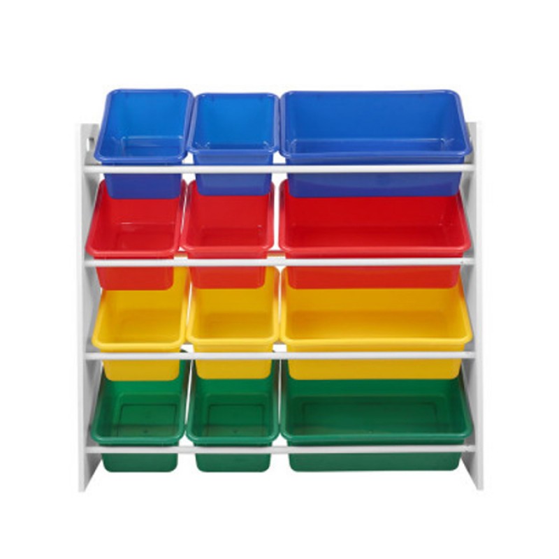 | Features | *Durable and practical *Eco-friendly and non-irritating paint *4-tier book rack *12 portable plastic bins *Two bin sizes *Safe and durable *Smooth rounded edges *Easy to assemble *Easy to clean |
