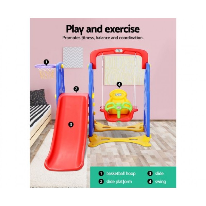 | Features | 130cm long slide, Child-safe swing, Basketball hoop, Wide and sturdy steps and handles, Anti-slip step patterns, Solid plastic construction, U-shaped stable base, Secured karabiners, Non-toxic PE plastic |