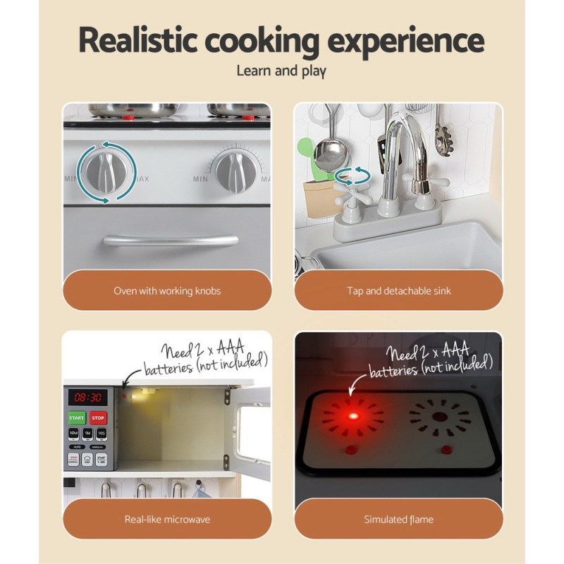 Every little aspiring chef needs their kitchen set! Let your little ones have fun cooking with our Keezi fully equipped modern kitchen play set. Our kitchen set comes with all modern kitchenware and appliances, such as a realistic rangehood with lights and fan, microwave, handy pegs, storage space, tap and removable sink, stove top and play pots, oven with working knobs and door, and cooking utensils for a real-like cooking experience. Made from a combination of solid wood and MDF, the kitchen set is sturdy and durable. It comes with safety and quality approval and non-toxic paint finish for your child's safety. Now your young chefs can develop several basic life skills all while cooking and serving delicious meals for you. Go and get your kids in the Keezi kitchen today.