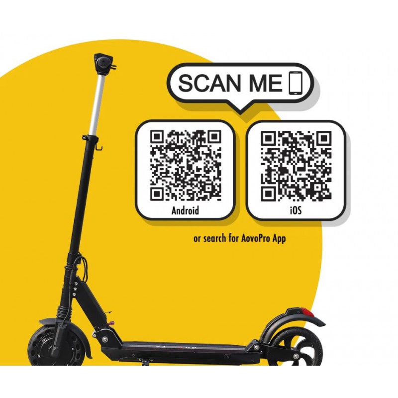 | Features | 36V 7.8Ah Folding Electric Scooter, smartphone app, 350W motor power, aluminium alloy frame with adjustable handlebar height, LCD colour dashboard, LED headlights, anti-skid solid tyre, tyre shock absorption, dual brake system including electronic and rear brake, climbing range up to 20°, cruise control setting, IP44 waterproof rating, zero + non-zero start, automatic shutdown, lock scooter with app, 3-speed safety maximum speed limit setting, foldable and portable for easy transport, throttle system, kickstand, horn ‘beep’ button, App: AovoPro |