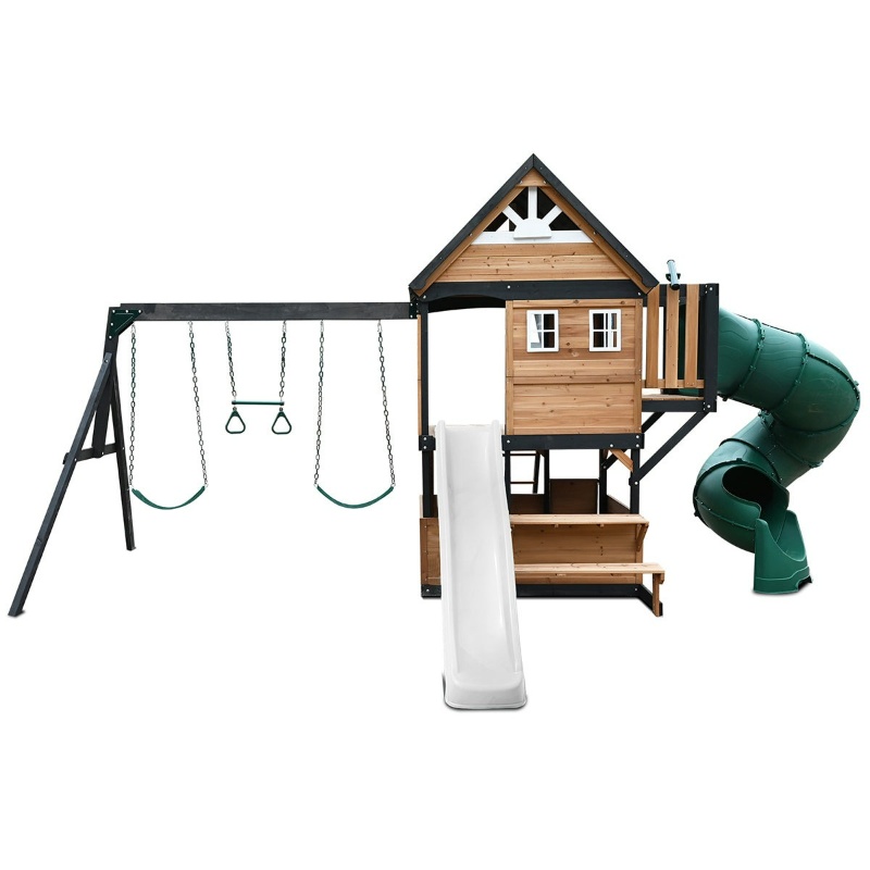 feature‑packed play centre combines climbing, swinging, sliding, and