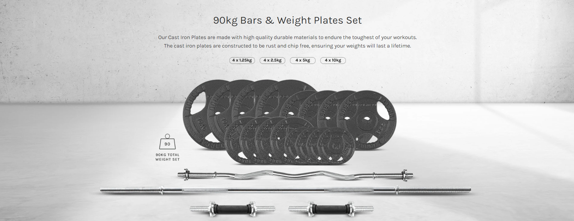 | Weight set | -4 x 10kg Cast Iron Tri-Grip Weight Plate -4 x 5kg Cast Iron Tri-Grip Weight Plate -4 x 2.5kg Cast Iron Tri-Grip Weight Plate -4 x 1.25kg Cast Iron Tri-Grip Weight Plate |