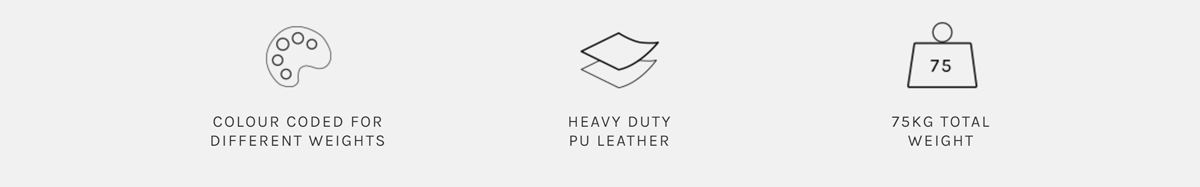 | Features | - Strong heavy duty PU Leather - Durable Strap handles for easy handling - Colour coded for different weights - Perfect for strength, speed, explosive movement training - Won't damage flooring when dropped -Filled with Sand & Cloth |