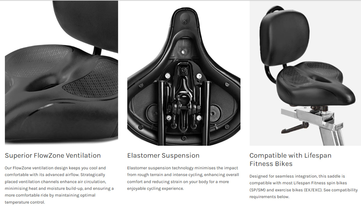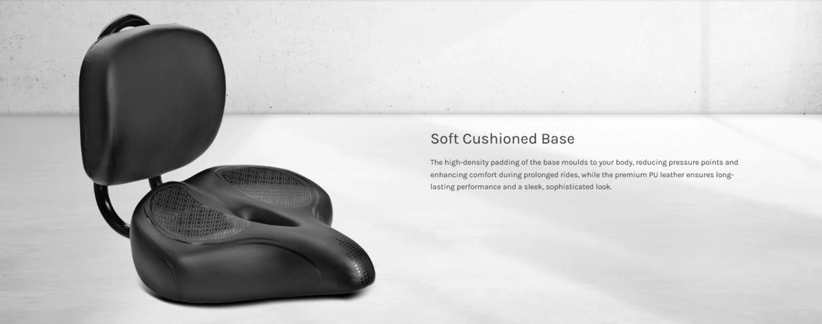 | Structure | - Cushioned Back Rest for Back Support - FlowZone Ventilation - Designed for both indoors and outdoors use - Fits standard seat posts of approx 25.4mm - Seat posts not included - Comes with Saddle Brackets - Angle Adjustable & Micro Adjust on Rails. |