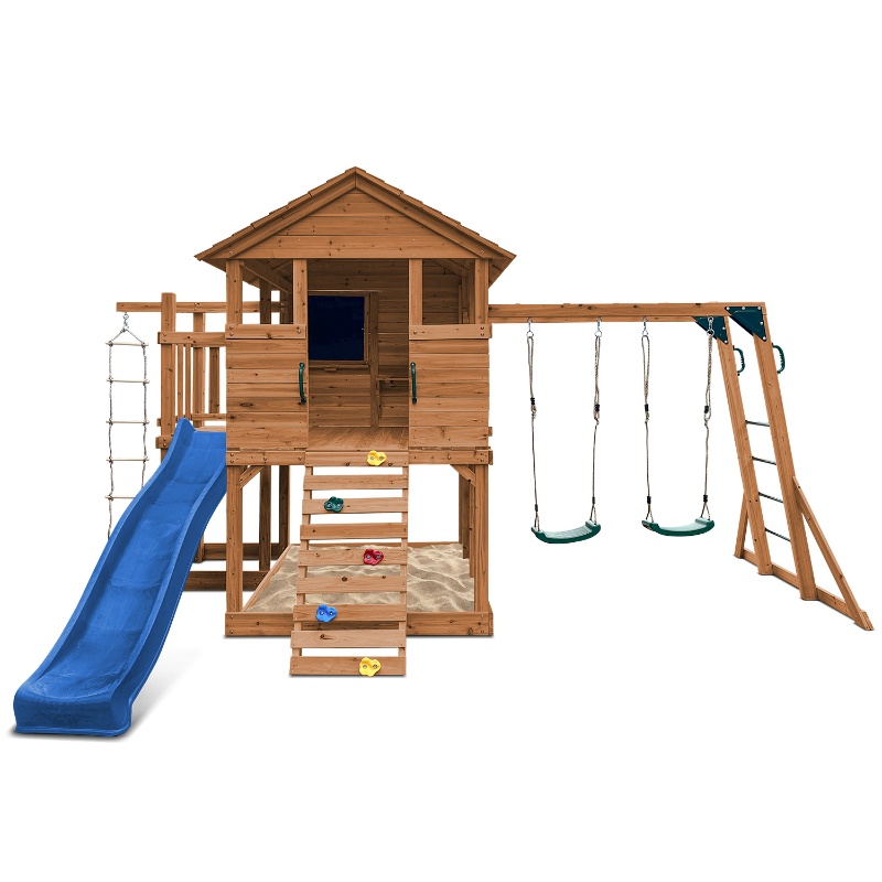 | Structure/Technical | - Premium Timber. - Massive, Wavy 2.2m Slide. - In-built Mini Play Kitchen. - Chalkboard. - Built-in Square Sandpit (W150cm x L150cm), Comes with tarp for sandpit. - Open Fort Style Cubby. - Rock Climbing Wall and side step ladder. - Well-positioned handles for safety. - 2m High Monkey Bar & Swing Frame combo (2m Length). - Comes with 2 Swing Seats. - Climbing Ladder on side. - Matte Stained wood for a smooth, natural finish. |