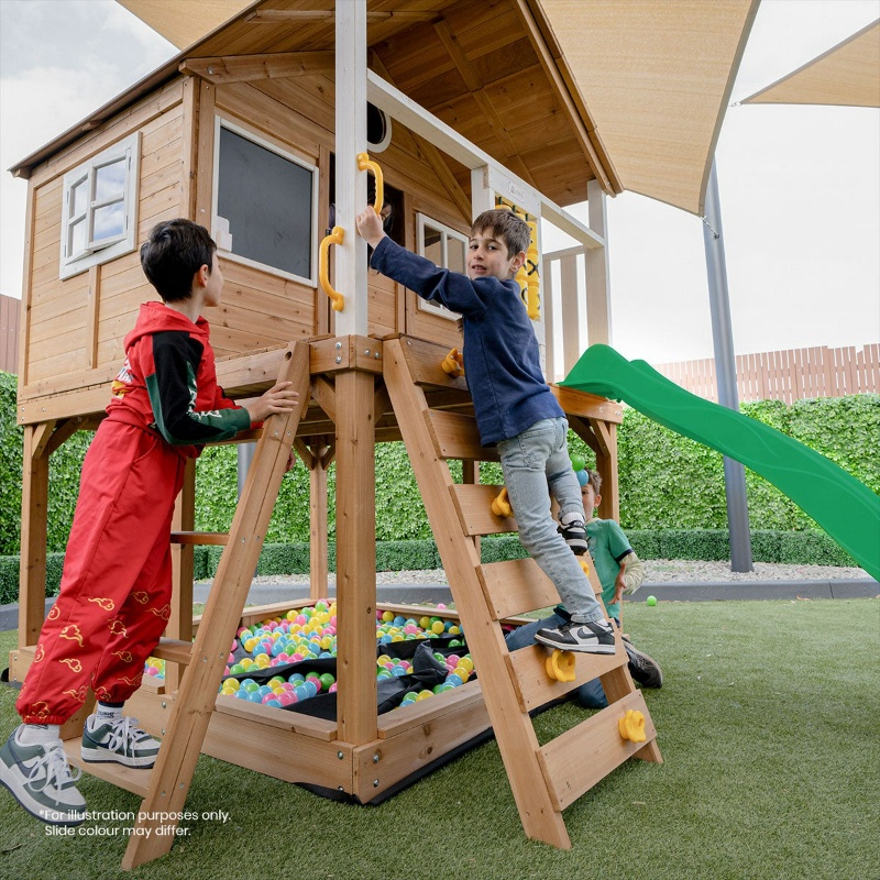 Capture the beach feeling in your backyard with the Warrigal Cubby House. This Queenslander style playhouse offers relaxed beach vibes for your kids in the massive sandpit under the raised Warrigal. Fun is on the horizon with a chalkboard, noughts and crosses, rock climbing wall and a 2.2m wavy slide.