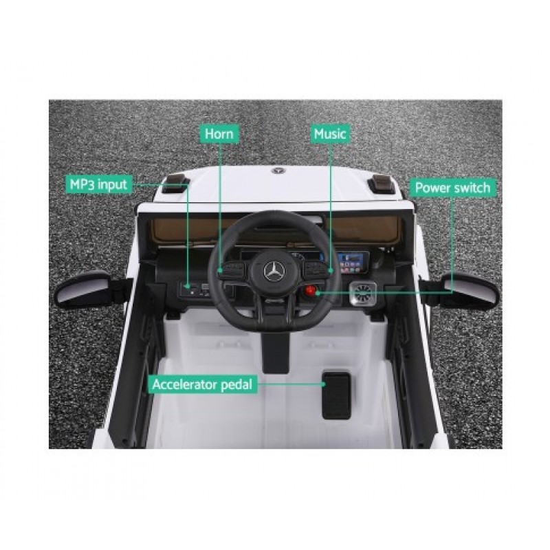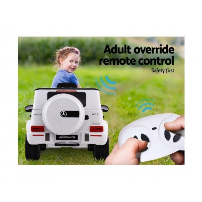 Let your little one experience the excitement of driving a Mercedes-Benz AMG G63. The steering wheel and acceleration pedal to control the forward and reverse movement give your child control and a realistic driving experience. It comes with some cool entertaining features that will allow your child to have hours of fun. It includes a safety seat belt and a remote control for parent supervision, making it the ideal choice for parents who want a safe and fun way for their children to explore their environment. The licensed Mercedes-Benz Ride on AMG G63 is the perfect gift for any young car enthusiast.