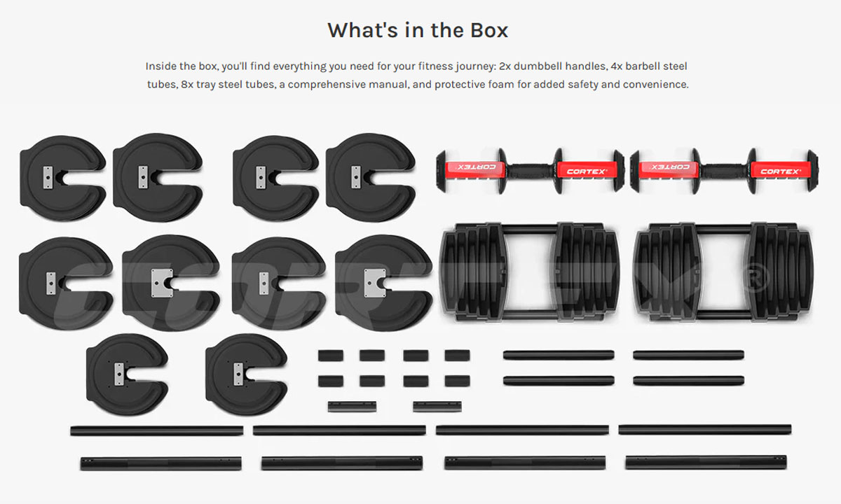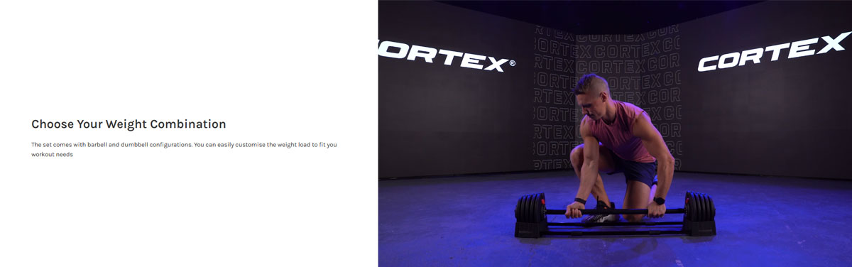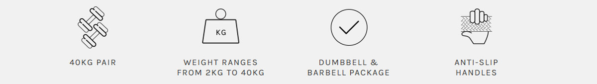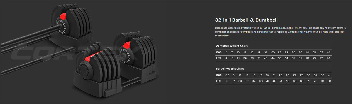 | Weight set | -32 Adjustable Weight Combinations -Dumbbell: 2kg - 40kg -Barbell: 2.5kg - 41kg |