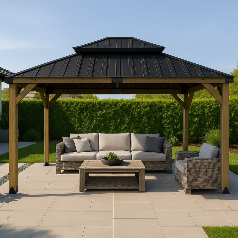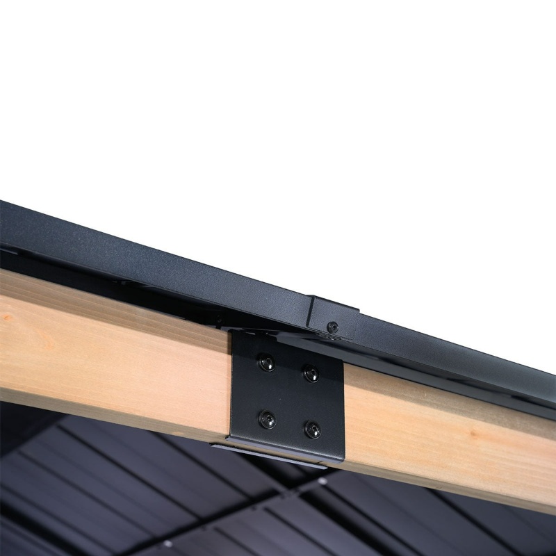 | Structure/Technical | 100% cedar wood construction, naturally resistant to rot and decay. 3m x 3.6m Sizing. Corrosion resistant steel roof provides weather protection. Double roof design for excellent wind rating, stability and venilation. 30-gauge galvanised steel roof to reduce heat transfer. Reinforced steel brackets for added security. Easy assembly - Pre-cut, pre-stained and pre-drilled for added convenience. |